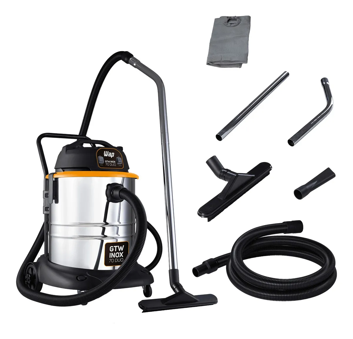Para quem procura facilidade e FORÇA BRUTA na hora da faxina, está na hora de conhecer o Aspirador WAP GTW INOX 70 DUO. O Lançamento da WAP é o mais robusto e superior aspirador da categoria, tenha o resultado de limpeza profissional no seu dia a dia. O poderoso Aspirador WAP GTW INOX 70 DUO possui dois motores com potência de até 2800 W, garantindo máxima eficácia na aspiração de sólidos e líquidos. Com reservatório de volume total de 70 litros, tendo capacidade útil para sólidos de 41 litros e capacidade útil para líquidos de 34,5 litros. Recipiente inox, que proporciona maior resistência e um lindo design. O Aspirador WAP GTW INOX 70 DUO é o mais indicado para trabalhos pesados em comércios como, lava cars, indústrias e pós obras, recolhendo com eficiência todos os resíduos. Tenha autonomia e segurança para ir e vir em áreas internas e externas com 4 rodas para transporte, cabo elétrico 4,5 metros, 2 travas do cabeçote, suporte para acessórios e bóia de água para segurança do motor. Uma opção inteligente para quem quer força com praticidade. O Aspirador WAP GTW INOX 70 DUO é o mais potente aspirador da família GTW e também a opção ideal para aspirar com facilidade áreas que exigem grandes esforços. Robusto e ágil, é equipado com mangueira de 3 metros, mais cabos extensores para alcançar inclusive as regiões mais distantes. Todas as funcionalidades com força POWER! Dentre os acessórios que acompanham estão bico canto, bico múltiplo e bico escova que permitem aspirar pisos, tapetes, carpetes, estofados e outros. A usabilidade é garantida com o fácil esvaziamento pela mangueira dreno. Limpeza leve ou pesada, tenha mais produtividade com o Aspirador WAP GTW INOX 70 DUO. ESPECIFICAÇÕES TÉCNICAS: POTÊNCIA ELÉTRICA: 2000W (127V) - 2800W (220V) TENSÃO: 127V ou 220V FREQUÊNCIA: 60 Hz MOTOR: Universal (127V - 2 Motores de 1000W) (220V - 2 Motores de 1400W) VOLUME TOTAL DO RECIPIENTE: 70 L CAPACIDADE ÚTIL DO RECIPIENTE (líquidos/sólidos): 34,5 L / 41 L VÁCUO: 200 mbar TIPO DE FILTRO: HEPA; Pano Lavável NÍVEIS DE FILTRAGEM: 2 ASPIRA ÁGUA: Sim PESO TOTAL: 20 Kg PESO LÍQUIDO: 15,2 Kg COR: Inox com Preto e Amarelo DIMENSÕES CABO ELÉTRICO: 4,5m DIMENSÕES MANGUEIRA: 3m DIMENSÕES DO PRODUTO (CxLxA): 61x57x83 cm DIMENSÕES DA CAIXA (CxLxA): 63x55x74,6 cm CONTEÚDO DA EMBALAGEM: Aspirador de Pó GTW Inox 70 DUO + Acessórios + Manual de Instruções ACESSÓRIOS: 1 Mangueira para sucção de 3 metros. 1 Extensão metálica reta de 700 mm. 1 Extensão metálica curva 600 mm. 1 Bico para cantos para utilização direta na mangueira. 1 Bico Múltiplo para utilização direta na extensão metálica. 1 Bico escova para utilização direta na mangueira. 1 Filtro Hepa. 1 Saco de Pano Lavável 50L. 1 Mangueira para dreno de 900 mm.