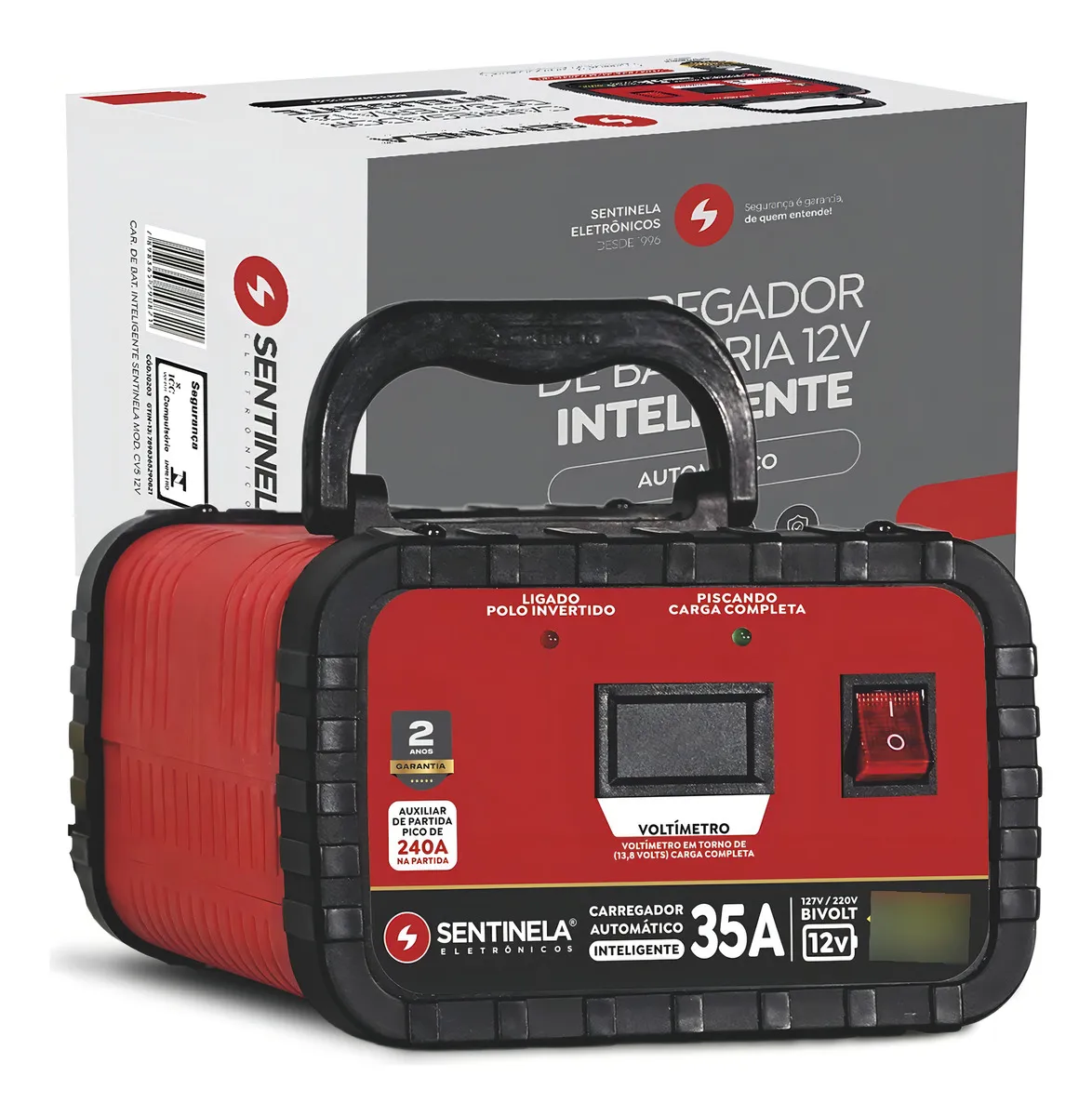 Os carregadores de bateria Sentinela são o diferencial na linha de carregador automotivo para uso doméstico ou profissional, adaptável a todo tipo de bateria e com flutuação com indicação por led. É a melhor escolha quando você precisa de um produto resistente e de fácil utilização. 10 benefícios que só os carregadores Sentinela oferecem: - Gabinete em termoplástico - Proteção contra inversão de polaridade - Flutuação com indicação por led - Display digital com led alto brilho - Garante maior vida útil para as baterias - Adaptável a qualquer tipo de bateria - Não exige aterramento - Proteção ativa contra curto circuitos - Ventilação otimizada - Suporte técnico para todo o país Descrição do Produto: Tensão de entrada: 127/220v com chave seletora de voltagem Corrente de saída: 35 amperes em 12v com pico 240 amperes na partida Proteção total contra inversão de polaridade Flutuação automática, não oferecendo risco de secar os vasos Carga lenta e rápida automática, conforme a necessidade da bateria Retificação: onda completa Potência: 700w Auxilia na partida em carros de passeio e camionetes Voltímetro digital Led verde indicador de flutuação Led vermelho indicador de inversão de polaridade Não danifica a eletrônica do veículo, não seca os vasos da bateria Recomendado para baterias de 40 amperes à 150 amperes Tempo de carga: 6h à 24h Com auxiliar de partida Dimensões: 16,3x16,5x11,2cm Peso: 5kg Os carregadores de bateria Sentinela são perfeitos para a carga de baterias chumbo-ácido automotivas e estacionários de diversos tipos de tecnologias, tanto com eletrólito líquido livre quanto seladas tipos: SLI, EFB, VRLA, AGM e GEL. Obs: O tempo da carga pode variar entre bateria nova, semi-nova e velha, por este motivo que é anunciado de 6 à 24 horas. Aplicação: carros, motos, camionetas, máquinas agrícolas e lanchas.