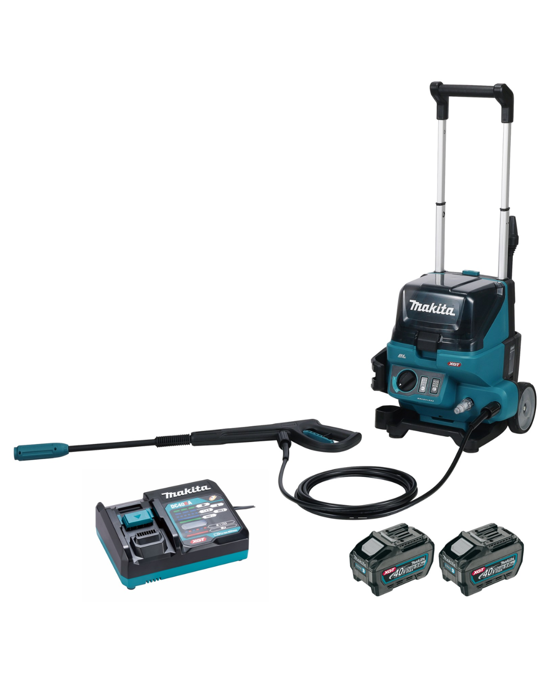 Manual, 2 baterias 40Vmáx (5,0Ah) BL4050F, 1 carregador DC40RA, pistola de pressão, bico regulável, extensor para bico regulável, lança jato ciclone, conj. de mangueira 3 metros, conj. de mangueira com filtro para puxar água de um tanque.